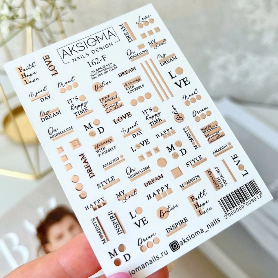 Aksioma Su Transferi Sticker 162-F AKSIOMA NAILS DESIGN markalı Aksioma Su Transferi Sticker 162-F, TrendNailMarket’te uygun fiyatlarla ve güvenli alışveriş garantisiyle. Daha fazla Su Transferi Tırnak Stickerları için hemen keşfedin! A965PY5ULG